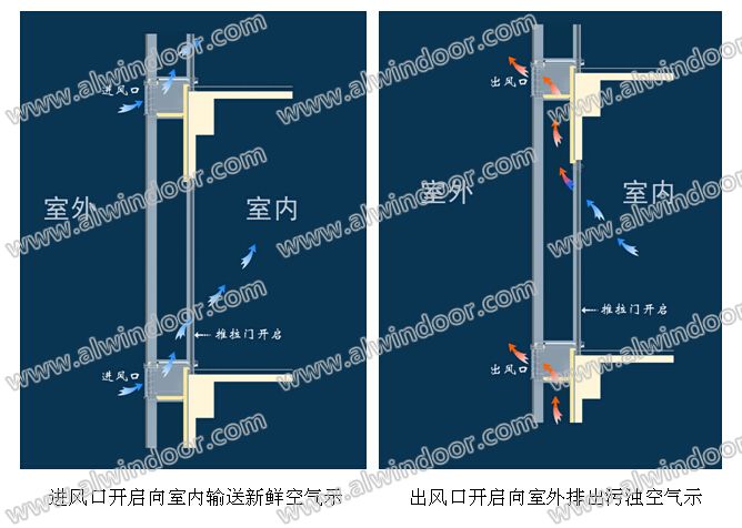 夏天通過電動控制系統開啟進出風口的電動百葉,利用通道內煙囪效應產生的壓力差使通道內的空氣快速流通,帶走室外太陽的輻射熱量,形成一道阻止室外熱空氣傳入室內的屏蔽墻,降低室內溫度;冬天通過電動控制系統關閉進出風口的電動百葉,利用溫室效應,使通道內的空氣通過吸收室外太陽輻射熱量,溫度升高,形成一道阻止室外冷空氣傳入室內的屏蔽墻,提高室內溫度;同時可以通過開啟內層推拉門,實現向室內輸送新鮮空氣或向室外排除污濁空氣的目的,完成室內外的通風換氣。春天和秋天,將層間百葉與內層門開啟,將室內與外界面溝通。運行圖示如下: