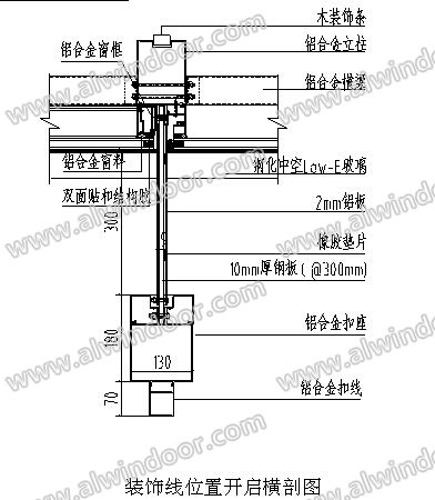 南北主立面采用明框幕墻系統,豎向外挑550mm寬130mm裝飾扣蓋,為了保證建筑的立面效果,外幕墻的開啟扇采用了隱藏式開啟,即將常規的開啟框與鋁龍骨一體化設計而開啟扇則內陷,使開啟扇位置與固定扇位置的室內外可見面效果一樣,看不到附加的窗框和窗扇,建筑效果非常簡潔、美觀。裝飾線位置開啟做法如下: