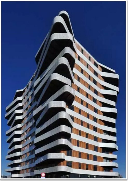 排名第三:扭曲旋轉(zhuǎn)異形立面。如果不借助3D軟件,一條曲線就可能讓你奔潰。