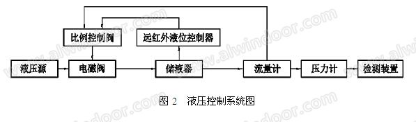 幕墻密封膠老化檢測所需的液體壓力值可根據幕墻設計要求的最大風荷載計算,一般不超過5KPa,因此實驗采用滲流流體壓力可按3~5 KPa設計,屬于低速流體,但液體壓力必須保持穩定。液壓伺服系統[1]有多種形式,本文自行設計,擬采用如下液壓控制系統(見圖2)