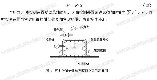 密封膠縫老化檢測裝置工作狀態充盈液體后(示意圖如圖3所示),設檢測裝置蓋頂面積為 ,液位壓力為 ,則蓋頂受到向上作用力 由下式求得:
