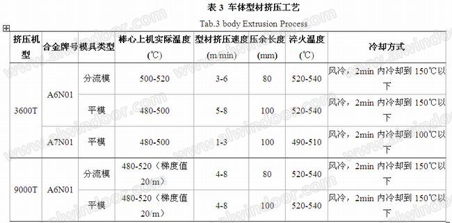 由于列車型材對(duì)強(qiáng)度、抗疲勞、抗腐蝕等要求高,因此鑄棒時(shí)必須保證爐內(nèi)合金高度合金化。而在制定模具(詞條“模具”由行業(yè)大百科提供)設(shè)計(jì)及擠壓工藝時(shí),除保證產(chǎn)品的成品率外,還需保證產(chǎn)品的尺寸精度和綜合力學(xué)性能等技術(shù)指標(biāo)要求。因此,在生產(chǎn)中,對(duì)熔鑄、擠壓和時(shí)效工藝都有嚴(yán)格的要求,具體執(zhí)行的工藝技術(shù)要求如表2~表4所示: