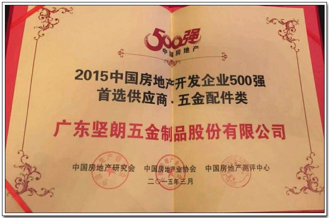 會上,主辦單位發(fā)布了最新測評成果,并為上榜“2015房企500強(qiáng)”、“2015房企500強(qiáng)首選供應(yīng)品牌”企業(yè)頒獎。堅(jiān)朗榮幸獲得“2015中國房地產(chǎn)開發(fā)企業(yè)500強(qiáng)首選供應(yīng)商•五金配件(詞條“五金配件”由行業(yè)大百科提供)類“獎項(xiàng),并且穩(wěn)居五金配件類品牌首位。