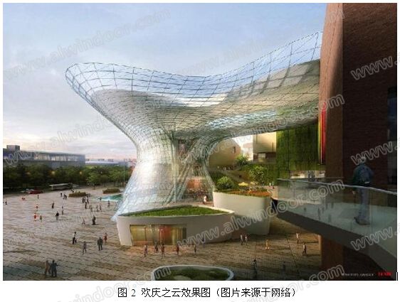 歡慶之云”造型取云的形態(tài)所代表的未來、開放、瞬間的寓意,整體形態(tài)簡(jiǎn)潔流暢,在建筑底部以三條云柱扭轉(zhuǎn)收分,形成逐級(jí)上升的動(dòng)勢(shì),具有強(qiáng)烈的未來感。在建筑中部,云柱扭轉(zhuǎn)展開,并相互聯(lián)系,逐漸于建筑頂部形成一個(gè)完整的曲線流暢的“歡慶之云”輪廓。整體“歡慶之云”形體以輕型鋼架支撐整體結(jié)構(gòu),在幕墻細(xì)部處理上以三角折面的透明玻璃、彩釉玻璃(詞條“彩釉玻璃”由行業(yè)大百科提供)形成漸變的立面肌理效果,與“瞬間”的設(shè)計(jì)概念相符合,也成為了整體建筑的中心。整個(gè)單體高34.8米,寬56.6米,長(zhǎng)75.8米,面積約8242平方米。共3982個(gè)板塊。
