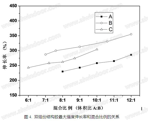 圖4所示三個(gè)試樣的最大強(qiáng)度時(shí)伸長率與混合比例的對應(yīng)關(guān)系。如圖4所示,隨著B組分含量的增加,最大強(qiáng)度伸長率逐漸下降。如果超過推薦的混合比例,B組分過多,膠固化后的最大強(qiáng)度伸長率會降低,影響膠的彈性。