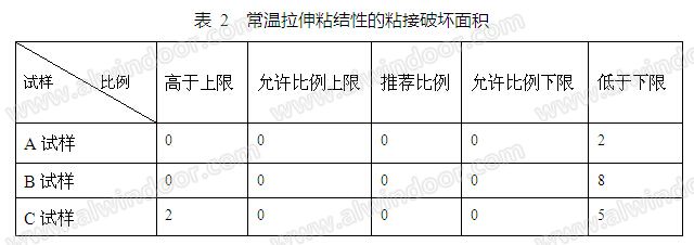 如表2所示,三種試樣在推薦比例范圍內(nèi),均粘接良好。而超出允許比例范圍,均出現(xiàn)小面積粘接破壞,分別為A試樣2%,B試樣8%和C試樣2%及5% 。