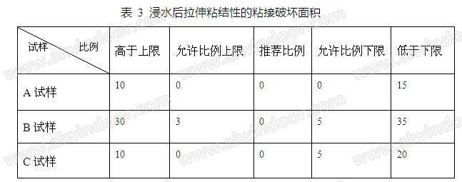 2.4.1 ,所測試的三種試樣的浸水后拉伸粘接性的粘結(jié)破壞面積,見表3