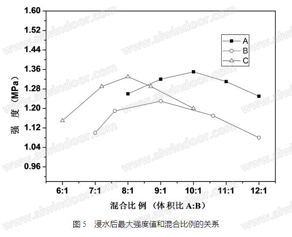 由上述分析可以認(rèn)為:雙組份結(jié)構(gòu)膠浸水后最大強(qiáng)度值在推薦混合比例時(shí)最大強(qiáng)度值相對最優(yōu)。大于或小于推薦比例,最大強(qiáng)度均有下降,在允許比例范圍內(nèi)最大強(qiáng)度相對不明顯;超出允許比例范圍,最大強(qiáng)度下降較為明顯。