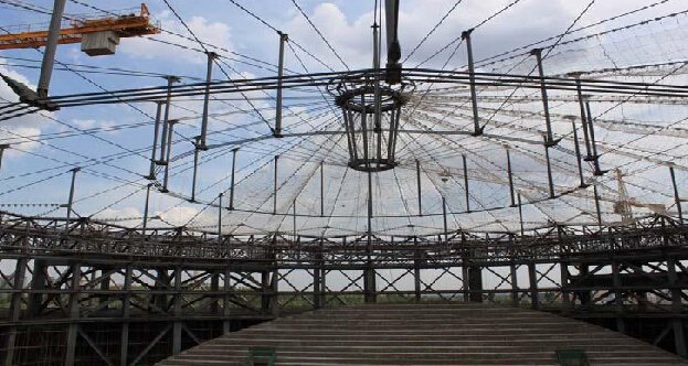 鄂爾多斯伊旗索穹頂結構是目前我國第一個自主研發設計施工的大型索穹頂結構工程,屋蓋建筑平面呈圓形,設計直徑為71.2m,屋蓋矢高約5.5m。由外環梁、內環梁、環索、斜索、脊索及兩圈撐桿組成,表面覆蓋膜結構。