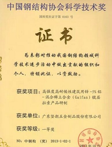 1 .堅朗五金作為第一完成單位,攜手堅宜佳五金共同研制開發的項目《高強度高耐候性建筑用鋅-5%鋁-混合稀土合金(Galfan)鍍層拉索產品研制》榮獲2013中國鋼結構協會科學技術進步獎一等獎。