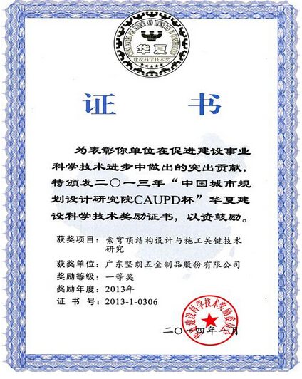 2. 堅朗五金作為完成單位,與行業內其他兄弟單位攜手完成的項目《索穹頂結構設計與施工關鍵技術研究》榮獲2013 華夏建設科技一等獎。