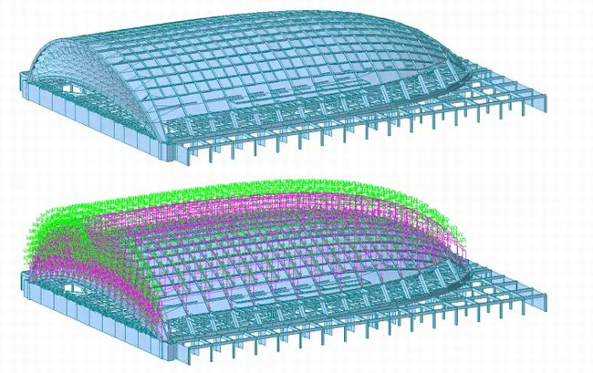 河北奧林匹克體育中心游泳跳水館100米跨采用拱殼鋼結構,由于拱殼結構本身的特點,在支座處產生較大的水平推力,從而使下部的支承結構處于承受水平力的不利狀態,為了避免直接傳遞到下部支承結構,預應力技術就是處理這類問題的好辦法,我們在拱架的兩個支承點之間設置預應力鋼絞線,從而把對支承結構產生的推力轉化為由預應力鋼絞線承擔的內力,減小變形的作用。本工程在游泳跳水館-1m標高板部分采用有粘結預應力技術,在2-A/2-M軸中布置8束9孔直線型有粘結預應力筋,均采用雙端張拉。