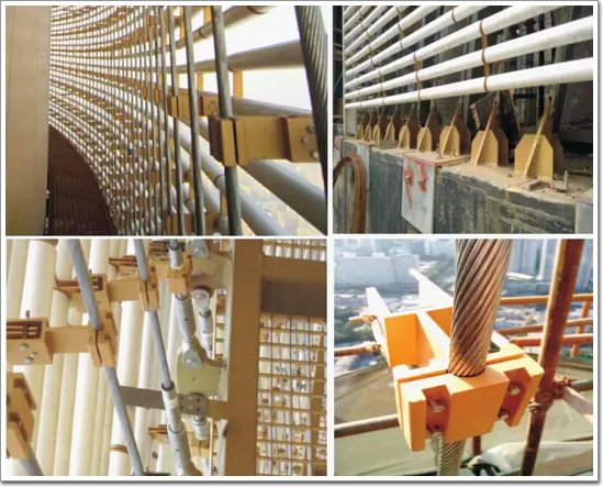 148.5m 以下部分內層為鋁板幕墻(詞條“鋁板幕墻”由行業大百科提供)系統,滿足保溫、防水等功能;外層為索結構陶棍系統,滿足外立面裝飾找形,中間為檢修及維護馬道。拉索結構外視不明顯,有利于外觀效果的完整性,同時索為柔性結構便于找形。其中拉索采用堅朗不銹鋼φ16拉索。