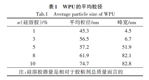WPU的平均粒徑及峰寬如表1所示。由表1可知:隨著硅溶膠摻量的不斷增加,WPU的平均粒徑和峰寬逐漸增大(平均粒徑由1%硅溶膠時的45.3 nm增至10%硅溶膠時的74.7 nm),這與PU分子之間的離子相互作用及縮合作用有關。