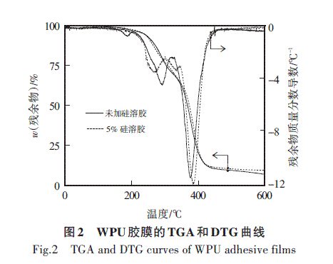 圖2 為硅溶膠摻量分別為0 和5%時WPU 膠膜的TGA 曲線。由圖2 可知:兩種樣品均有3 個明顯的熱降解區域,說明改性前后WPU 膠膜均至少有3 個不同特性的降解階段;純WPU 的3 個降解階段發生在180~225 ℃、225~330 ℃和330~450 ℃范圍內,改性WPU 的3 個降解階段則分別發生在220~315 ℃、315~360 ℃和360~450 ℃范圍內;改性后膠膜的TGA曲線向右平移,說明其耐熱性提高。