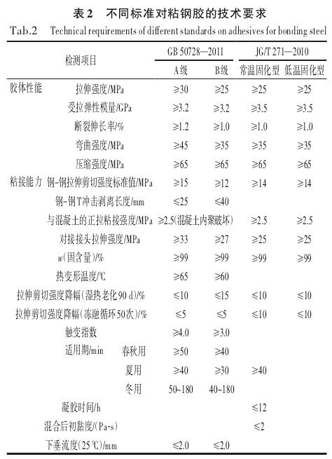 對于膠體性能而言,GB 50728—2011 在原有GB 50367—2006的基礎上,適當降低了拉伸強度和彈性模量的指標,增加了熱變形溫度的測試項目;對于粘接能力而言,增加了鋼-鋼沖擊剝離長度和對接接頭拉伸強度,取消了不均勻扯離強度。