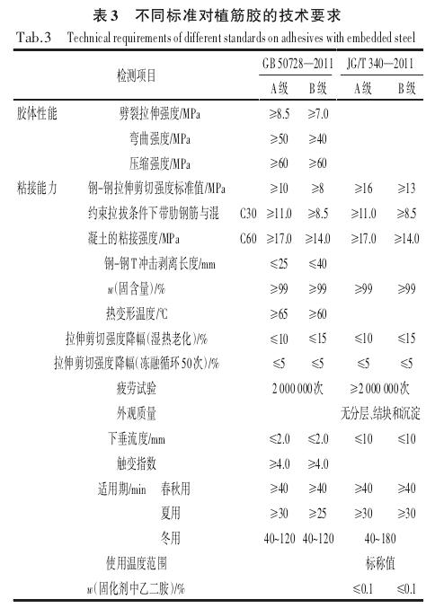 植筋錨固膠(又稱植筋膠或錨固膠)的標準主要有國標GB 50728—2011 和行標JG/T 340—2011,具體技術要求如表3所示。