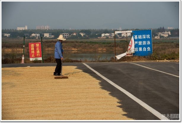 2014年10月18日,湖南長(zhǎng)沙當(dāng)?shù)氐囊晃晦r(nóng)民在專(zhuān)門(mén)為“遠(yuǎn)大天空城市”項(xiàng)目修的望湖路上晾曬稻谷。這條路西起金星路,東抵規(guī)劃中的大澤湖路,長(zhǎng)度為370米(已建成280米),寬30米,投資額為1200萬(wàn)(含900萬(wàn)征拆費(fèi)用)。
