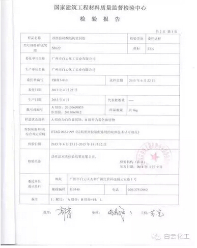 白云超高性能結構密封膠同時符合國家標準GB16776、美國標準 ASTM C1184和歐洲標準ETAG 002,另外還符合白云的企業標準Q/BYHG13。
