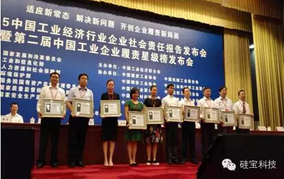 硅寶科技作為新材料行業(yè)唯一的民營高科技上市企業(yè)代表,憑借企業(yè)在2014年度的社會(huì)責(zé)任價(jià)值觀與戰(zhàn)略、社會(huì)責(zé)任推進(jìn)管理、經(jīng)濟(jì)、環(huán)境、社會(huì)影響和履責(zé)創(chuàng)新六方面取得的優(yōu)異表現(xiàn),從上百萬家工業(yè)企業(yè)中脫穎而出,榮獲由中國工業(yè)經(jīng)濟(jì)聯(lián)合會(huì)和聯(lián)合國工業(yè)發(fā)展組織聯(lián)合頒發(fā)的“第二屆中國工業(yè)企業(yè)履責(zé)五星級(jí)企業(yè)”。這是繼2014年獲得“首屆中國工業(yè)企業(yè)履責(zé)五星級(jí)企業(yè)”稱號(hào)以來,再度獲此殊榮。自2010年起,硅寶已連續(xù)第六次發(fā)布社會(huì)責(zé)任報(bào)告。硅寶一直秉承“技術(shù)不斷創(chuàng)新、品質(zhì)精益求精、服務(wù)及時(shí)有效”的經(jīng)營方針,并積極履行經(jīng)濟(jì)責(zé)任、利益相關(guān)者責(zé)任、環(huán)境責(zé)任、社會(huì)公益責(zé)任、文化責(zé)任,取得了良好的社會(huì)效益。