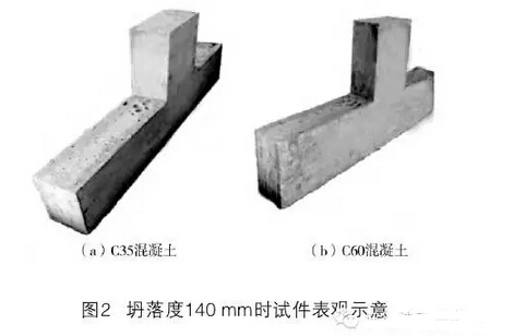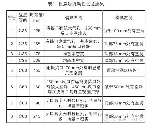 通過進行多次的模型試驗,研究超灌法工藝產生的質量通病機理,依據流動性、密實性與強度試驗結果,對混凝土材料性能、超灌高度、振搗工藝等進行標準選擇與工藝調整,然后對調整后的參數進行工程現場原位試驗。