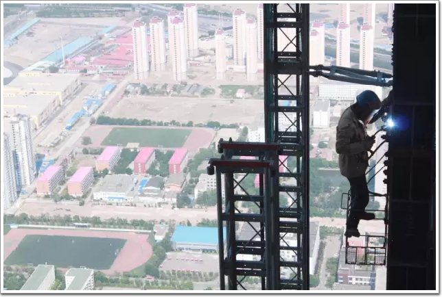 隨著高聳入云端的施工電梯緩緩爬升,我感覺有點腿軟,嚇得哆哆嗦嗦,同行的幾個年輕工友面帶微笑看著我。