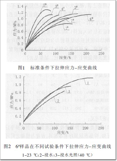 按GB/T13477.8-2002《建筑密封材料試驗方法》(第1部分:拉伸粘結性的測定)制備3組試件,在23℃下分別養護28 d(單組分)或14 d(雙組分),其中1組在23℃進行拉J巾試驗;第2組浸入標準條件下的水中7d后立即進行拉仲試驗;第3組放入水一紫外線輻照試驗箱中浸水光照300 h(溫度40℃)后進行拉仲試驗。拉仲試驗時分別測定拉仲至仲長率為60%時的拉仲模量、竣大應力時仲長率、拉仲粘結強度和斷裂(詞條“斷裂”由行業大百科提供)仲長率,同時記錄拉仲應力一應變曲線(詞條“應變曲線”由行業大百科提供)(見圖1.圖2)。