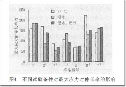 (5)最大應力時仲長率在一定程度上能反映出產品的強度與彈性之間的關系,一味追求強度,勢必會帶來產品在彈性方面的損失,而表現出低的仲長率,如.樣品.