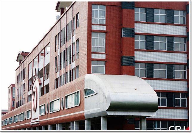 2015年8月26日,河南鄭州,鄭州鄭東新區心怡路永平路附近,有一座帶有“火車”的樓房。據了解,這是鄭州101中學新校區的樓房,因該學校原為鐵路系統的學校,所以設計樓房時融入了“鐵路”元素,這個“火車”為高鐵動車組形象,實為走廊,走廊的一頭為動車組車頭,另一頭的“鐵軌”為天橋,連接了被道路隔開的兩片校區。