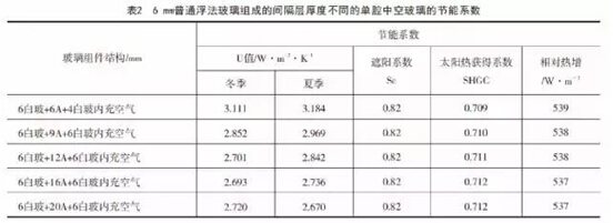 6mm普通浮法玻璃組成的間隔層厚度不同的單腔中空玻璃的節能系數見表2。