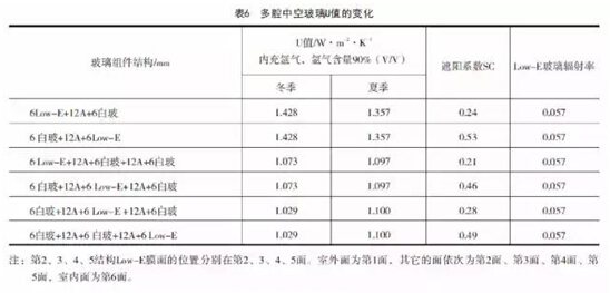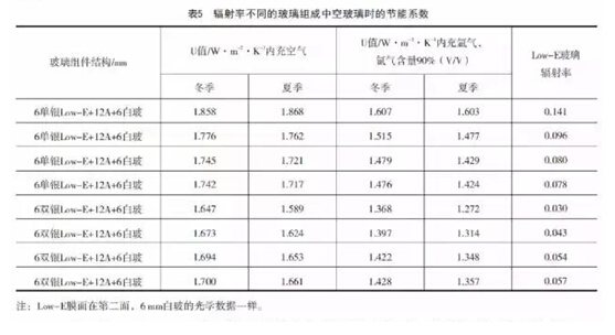 輻射率不同的玻璃組成中空玻璃時的節能系數見表5