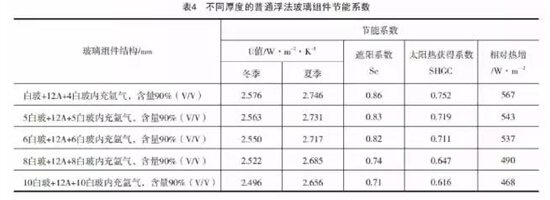 不同厚度的普通浮法玻璃組件的節能系數見表4。