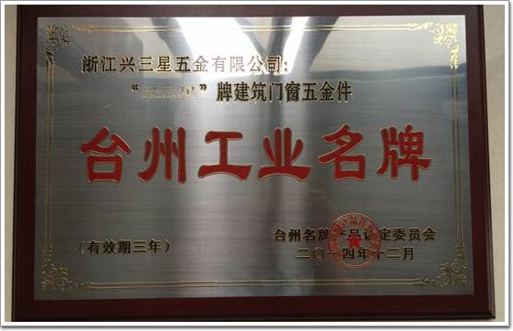 浙江興三星五金有限公司“興三星”牌建筑門窗五金件被臺州名牌產品認定委員會授予“臺州工業名牌”榮譽稱號。該榮譽的獲得提升了興三星品牌在門窗幕墻行業市場競爭力和品牌影響力,樹立良好的企業形象,提高綜合實力。