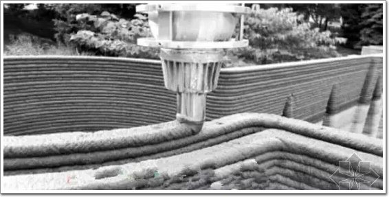3D打印房屋的過程有些類似奶油裱花,由一個巨大的噴頭不斷噴出灰色的油墨,油墨呈“Z”字形排列,層層疊加,很快便可砌起一面高墻。之后,墻與墻之間還可用鋼筋水泥進行二次“打印”灌注,連成一體。