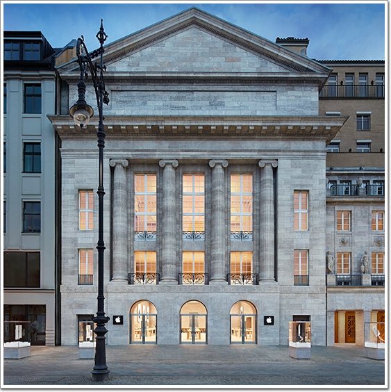 上圖所示的蘋果零售店位于德國(guó)柏林,同樣也是采用了“全天然石材”的幕墻外圍護(hù)結(jié)構(gòu),該店于2013年5月開業(yè),它由柏林一家電影院改建而成。