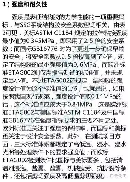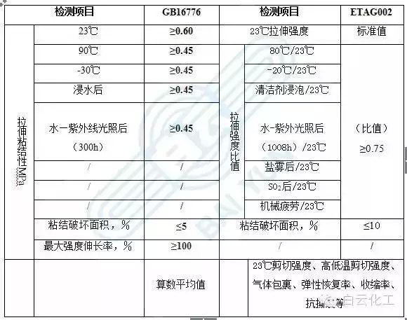 通過以上三個標準介紹和對比,考慮到全面指標,很難準確說哪個標準最嚴格。中國標準GB16776綜合考慮硅酮結構膠的施工性能、安全性能和彈性(詞條“彈性”由行業大百科提供),規定了結構膠的最低強度值和伸長率,大多數性能測試項與美標C1184相同,但多數性能指標要求尤其是力學指標要求是高于美標ASTM C1184,可以說,國標GB16776整體性能指標要求是高于美標的。而歐標ETAG002要求結構膠性能在各影響因素下具有較高的保持率,對硅酮結構膠的使用壽命影響因素考慮得更加全面與完整。