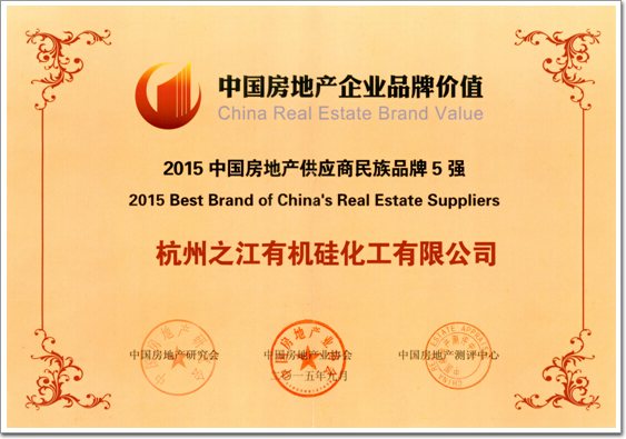 近日,由中國房地產業協會、中國房地產研究會、中國房地產測評中心三家單位聯合主辦的“2015中國房地產企業品牌價值測評成果發布會暨房地產品牌發 展高峰論壇”在重慶隆重召開。會中發布了備受期待的《2015中國房地產企業品牌價值測評報告》以及相關榜單,杭州之江有機硅化工有限公司被評為2015年中國房地產供應商民族品牌5強。