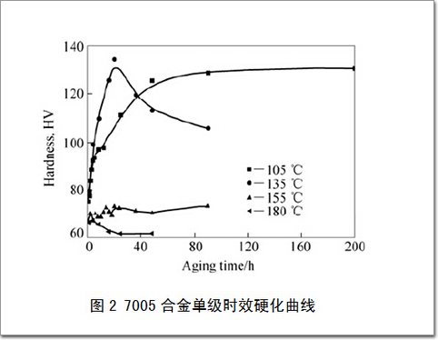 時效溫度對合金的沉淀的析出有很大影響,在不同時效溫度下,析出相的臨界形核尺寸、類型、以及聚集長大速度都不相同。當時效溫度較低時,剛開始合金的沉淀相析出較快,合金的時效強化效果明顯,后期析出相的析出以及長大緩慢,低溫時效能夠到較高的強度,但是需要較長的時間才能達到峰時效。隨溫度升高:溶質原子的擴散系數提高,析出相的沉淀析出的速度增加,同時溫度高更利于過渡相11‘和平衡相n的形成。當合金的時效溫度逐漸升高時,合金到達峰值硬度的時間縮短,但是峰值硬度會相應的降低,圖2為7665合金的時效硬度曲線。7xxx鋁合金在自然時效過程中,合金電導率隨著自然時效時間的延長逐漸降低,而合金的強度逐漸上升最終趨于平穩,而在人工時效過程中:由于析出較多的亞穩定相和平衡相,電導率一般隨時效時間的延長逐漸上升。因此,對不同的合金的性能要求選取合適的的溫度。