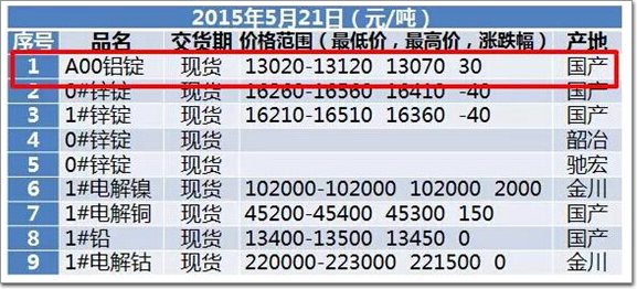 如下圖所示,2015年5月21日平均價為13070元/噸。該價格主要受市場行情影響而變動,一般約定在±10%以內不調整(以鋁含量10kg/㎡計算,價格風險大約是13元/平,約占斷橋門窗綜合單價600元/平米的2%)。一般約定承包人一次性訂貨一個單體建筑整棟樓的鋁錠,每個單體建筑只做一次性調價,紗門窗用鋁型材一般不進行調價。