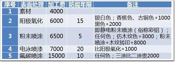 、表面處理方式:陽極氧化、粉末噴涂、電泳噴漆、氟碳噴涂(詞條“氟碳噴涂”由行業大百科提供)等價格依次升高。