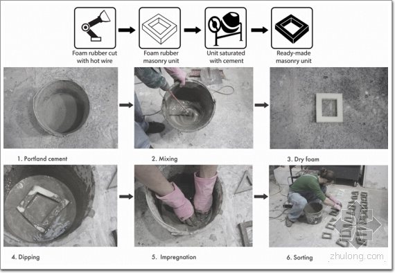 磚塊都是由橡膠源性泡沫物質制成。先通過計算機里的模型控制4軸熱切割絲,在很短時間內(nèi)就可以按程序設定切割出不同形狀的橡膠源性泡沫,然后將這些切好的材料放到波特蘭水泥混合物中浸泡至硬化,不同空隙密度(詞條“密度”由行業(yè)大百科提供)的泡沫經(jīng)過處理后就變成了形態(tài)各異的磚塊。磚塊硬化完成后就可以拿來使用了。DmytroZhuikov和ArinaAgieieva相信這種方法制造的智能磚可以大大加快施工進度,同時降低能源和材料的消耗。