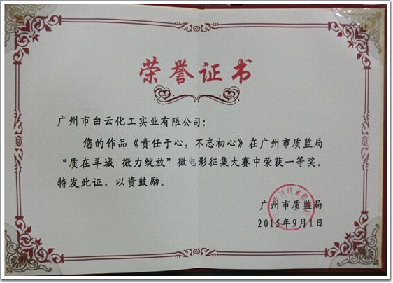 2015年9月1日,“質在羊城,微力綻放”微電影征集大賽頒獎典禮在廣州市華泰賓館舉行。廣州市白云化工實業有限公司選送的微電影《責任于心 不忘初心》經過質監局、微電影協會、高校、電視臺等眾多專業評委們的嚴格評審,最終從40多部參賽作品中脫穎而出,成為“質在羊城,微力綻放”微電影大賽唯一的一等獎獲得者!