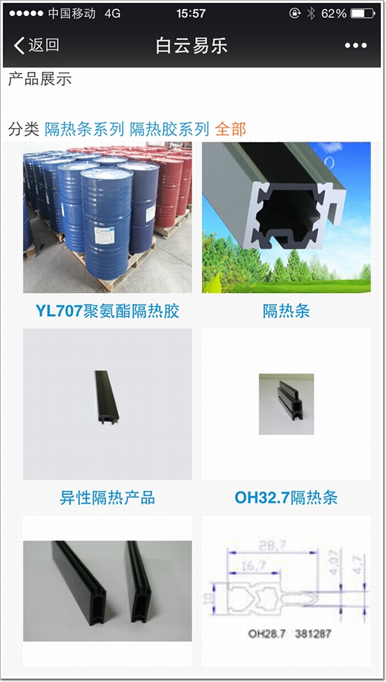 目前該平臺上有“走進易樂、產品中心、工程案例”三個欄目。產品中心有“隔熱(詞條“隔熱”由行業大百科提供)條系列和隔熱膠系列”,工程案例中有“典型案例和合作伙伴”等項目,內容還在逐漸完善階段。