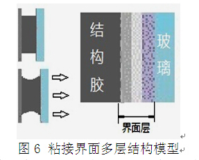 粘接依賴(lài)界面物理吸附、化學(xué)鍵生成及機(jī)械咬合實(shí)現(xiàn)連接,粘接界面力學(xué)特性不連續(xù),被粘玻璃、金屬為理想彈性體,密封膠為粘彈性體,接頭受拉位移伸長(zhǎng)時(shí)粘接體界面被約束不變形,界面層外緣受拉伸同時(shí)受剪切,集中應(yīng)力作用首先局部界面層剝離。破壞面可能看不到膠層痕跡,但顯微鏡下可見(jiàn)殘膠,有時(shí)在電子能譜儀下檢查可見(jiàn)殘留的粘接材料分子層,表明破壞實(shí)際發(fā)生在界面層。界面層由被粘表面層、粘接咬合面、受影響粘接層和粘接材料多層結(jié)構(gòu)組成(圖6),被粘材料表面性質(zhì)及狀態(tài)、涂膠缺陷、氣泡、裂隙、使用形式和應(yīng)力水平、低溫、高溫、紫外線輻照、鹽霧、濕熱、熱沖擊、介質(zhì)腐蝕等因素,均會(huì)影響粘接界面穩(wěn)定性。試驗(yàn)表明幾種高性能硅酮結(jié)構(gòu)膠粘接穩(wěn)定,但在水-紫外線及鹽霧加速老化條件下仍有脫膠(表3);在陽(yáng)極氧化、氟碳噴涂、無(wú)底漆粉末噴涂和有底漆粉末涂層四種表面上粘接,多種品牌結(jié)構(gòu)膠剝離試件經(jīng)55℃濕熱2000小時(shí)加速老化后,A膠、C膠在氟碳涂層表面脫膠,B膠僅在陽(yáng)極化表面脫膠,D膠僅對(duì)氟碳涂層粘接穩(wěn)定,對(duì)其他表面均產(chǎn)生脫膠,可見(jiàn)脫膠的離散性和隨機(jī)性,如表4。