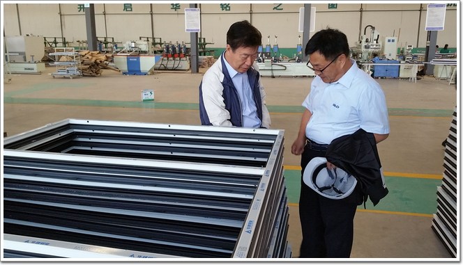 姜成愛在寶龍達實業集團副總裁姚朋建的陪同下參觀了門窗幕墻系統加工廠區