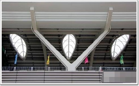 屋頂的天窗采用立體的葉片形狀,和波浪線完美融合,豐富了建筑的第五立面,同時也增加了站臺內天棚的藝術性,立體的天窗利于雨水的沖刷,以便保持其通透性。沿街側墻的連續三角形幕墻與V字支撐相呼應,虛實相間,更增加了建筑的整體感和設計感。