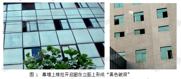 推拉窗密封性能較差,在風雨交加時很容易從邊縫向室內冒水,開啟后的問題和平推窗相同,存在安全隱患,也影響幕墻的外觀(圖1)。
