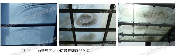 水平放置的玻璃面板在自重和雨水作用下會向下凹陷,其允許撓度(詞條“撓度”由行業大百科提供)為短邊長度的1 / 60,為排除積水,雨棚的坡度不能小于 3% ,最好更大一些。有些圖紙上標注 1% 或2% 的坡度是不正確的,會產生污垢沉積(圖7)。
