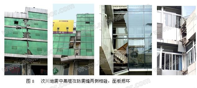 幕墻在主體結構的防震縫部位應有構造措施,防止主體結構兩側相對位移時幕墻被損壞。在2008年汶川大地震中建筑幕墻表現良好,基本上沒有發生明顯的震害,但是個別工程因為防震縫部位沒有采取相應措施,兩側幕墻相碰造成玻璃板塊破損(圖8)。