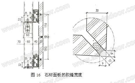 對于石材等粗糙多孔表面,膠縫設計要求膠縫寬度不小于膠縫厚度,考慮到石板加工安裝偏差較大,板縫寬度不應小于8mm(圖16)。